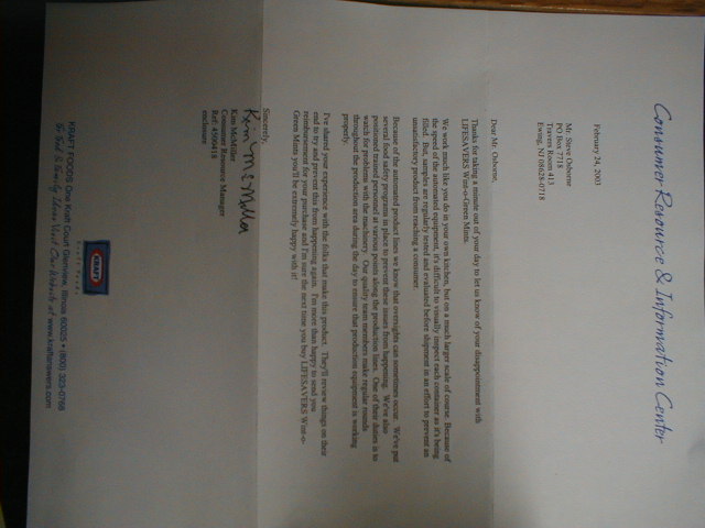 disgusting lifesavers. Steveo complained about the products we received and pleaded with Nabisco to